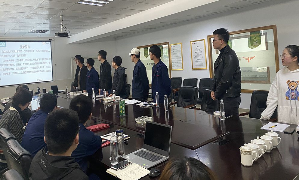 第三項(xiàng)議程:拜師儀式。儲(chǔ)備干部雙手遞送茶杯,依次走到自己導(dǎo)師面前,給導(dǎo)師敬茶,深深鞠躬,并說(shuō)到“師傅,您辛苦了,請(qǐng)喝茶”。導(dǎo)師舉杯喝茶,并回禮相贈(zèng),完成拜師敬茶儀式。導(dǎo)師與儲(chǔ)備干部分別進(jìn)行宣誓,以表示締結(jié)濃濃的師生情。
